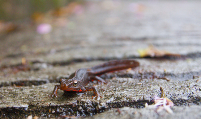 对于有心亲近自然的朋友,老天总是会给予额外的奖励。当大家冒雨游览学习的时候,一只蝾螈从枯叶堆中走了出来,大摇大摆地过马路,我们都惊呆了。要知道树蛙出入森林这么多年,这也只是第二次见到蝾螈,上回还是在云南高黎贡山的深山密林里。