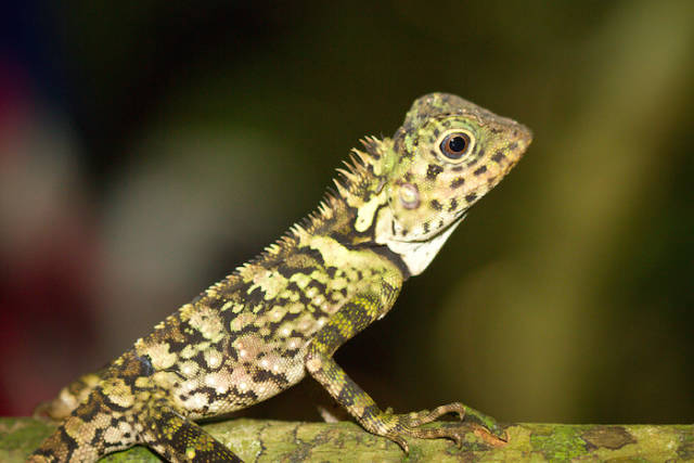 一只角蜥威武地地立在树枝上,在众人面前也不亢不卑,仿佛让我们看到恐龙的身影。