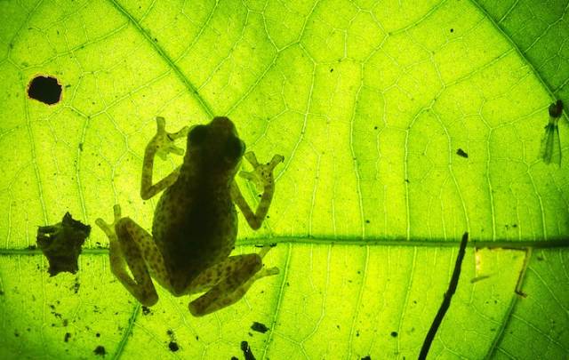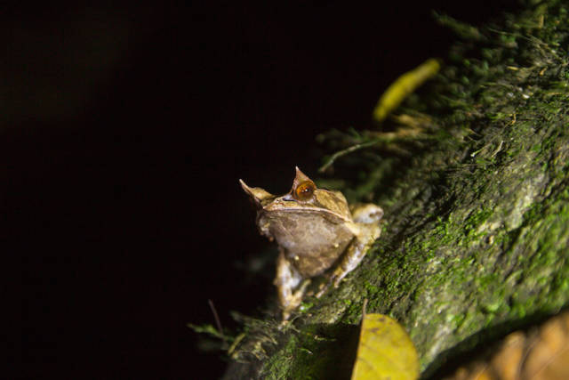 当角蛙抬头,它那三角形的眼角看起来霸气十足,宣示着自己的领地。然而当它低头匍匐,却伪装得如同一片叶子,悄然融入周遭的环境中。
