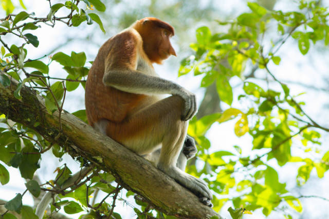 长鼻猴端然坐在树上的坐姿很有官老爷的样子,它有着胡萝卜一般的长鼻,圆嘟嘟的啤酒肚。却是因为所吃的红树林叶子中含有毒素,需要一个很大的胃来进行长时间消化。当然,别看它大腹便便的样子,却能在树林高处飞来串去。