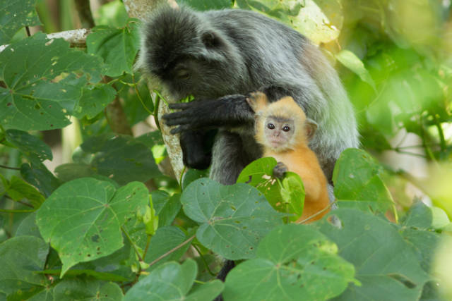 银叶猴和它的宝宝,一金一银,差异如此之大,怪不得有人怀疑是不是亲生的……这只银叶猴宝宝好奇地看着我,让我想起在云南拍摄灰叶猴时它们紧张、见人就跑的情形,不由地为生活在这里的猴子高兴,想必它妈妈早已告诉它,树下这种两只脚走路没毛的动物,还是我们是亲戚呢!